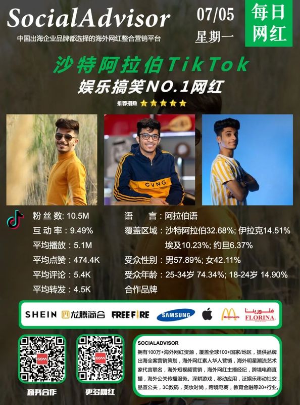 沙特阿拉伯娱乐搞笑NO.1网红,是一名居住在沙特达曼的23岁年轻人。他在视频中通过扮演母亲,父亲等四个角色,来讲述日常生活的趣闻轶事,通过极具感染力的幽默表演,因此在TikTok上收获了1050万粉丝,他的近30个视频的平均播放量为510万,粉丝可以覆盖沙特,伊拉克,埃及和约旦等中东国家。他曾经推广快时尚平台SHEIN,游戏苏丹的复仇等。